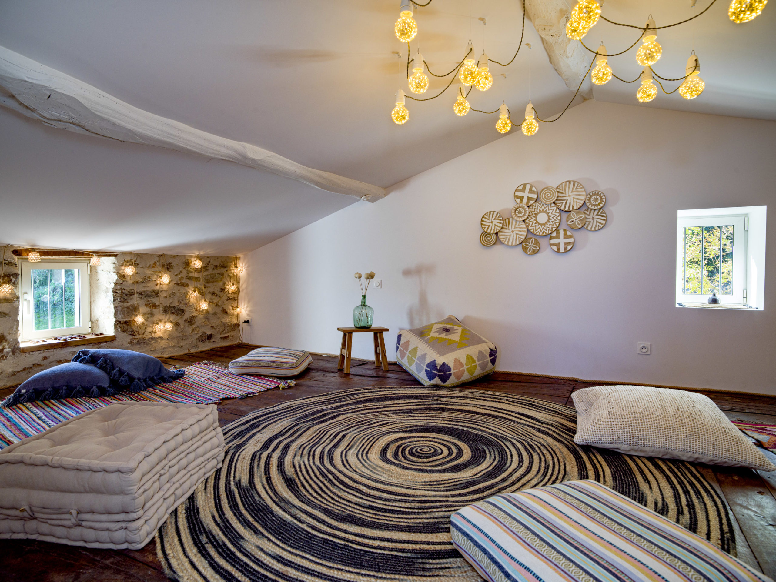Aménagé avec des tapis et coussins en fibres naturelles, éclairages doux et ambiance chaleureuse, il offre un cadre sécurisant pour les temps plus introspectifs ou thérapeutiques.